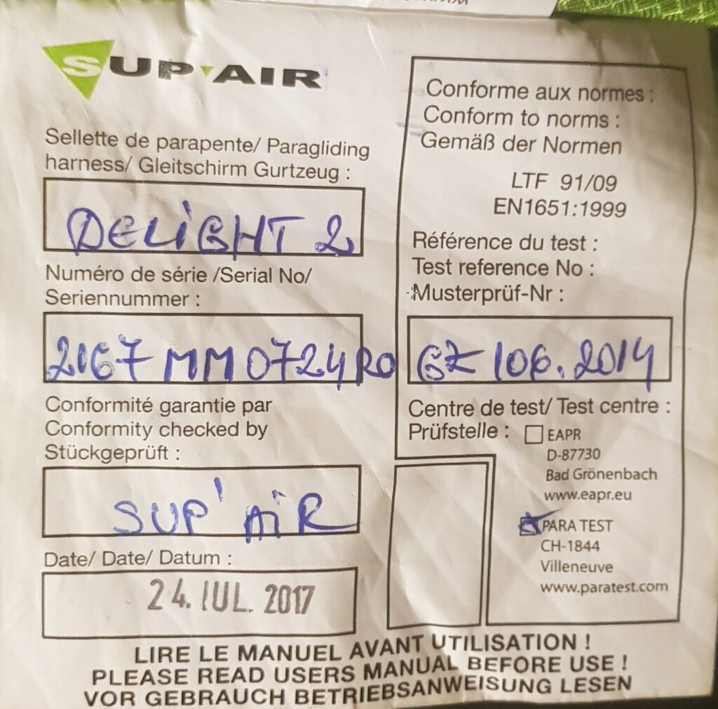 FOR SALE: SupAir DeLight 2 – Lightweight XC Harness (M)